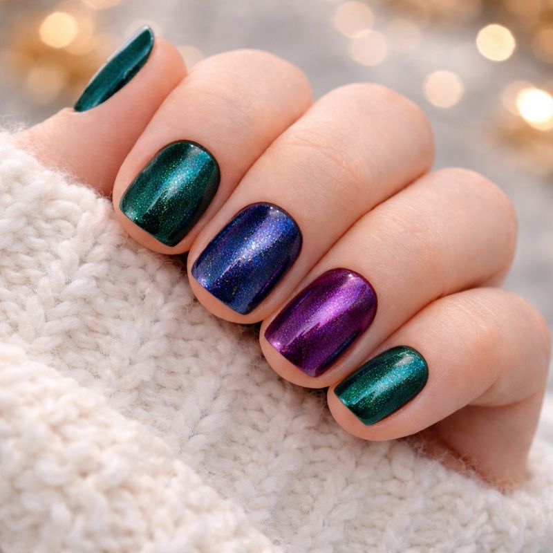 Deep jewel tones like emerald, sapphire, or amethyst work incredibly well with this effect, creating dimension and depth on even the shortest nail beds.