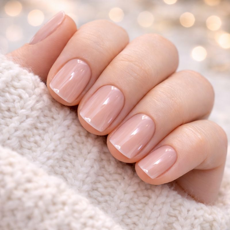 Neutral tones like nude, soft pink, or milky white work best because they let the shine be the star.