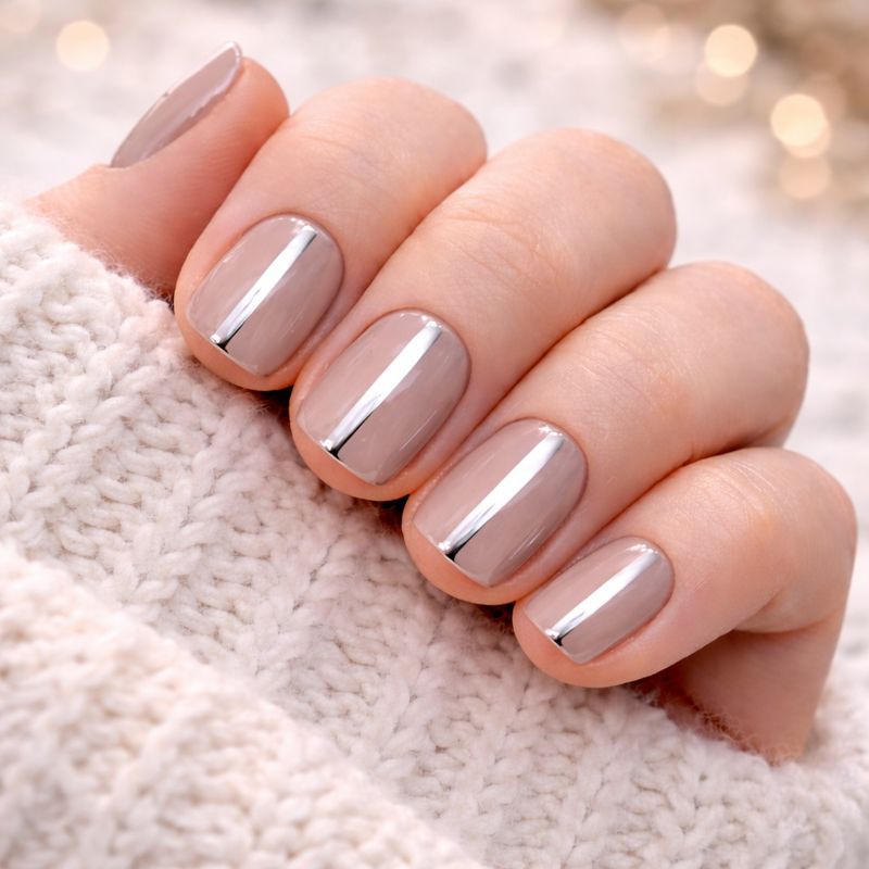 Think beige or taupe nails with a single chrome stripe down the center, or perhaps chrome tips on a soft gray base.