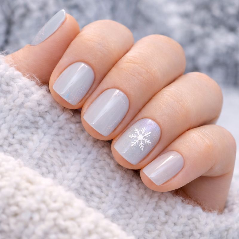 A single small snowflake on a nude or pale blue base feels elegant and intentional rather than cluttered.
