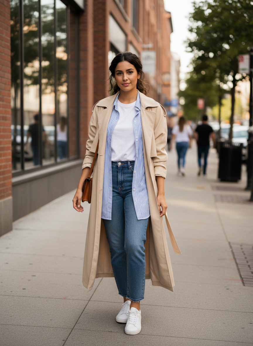 1. White Tee + Oversized Button-Down + Straight-Leg Jeans + Sneakers + Light Trench