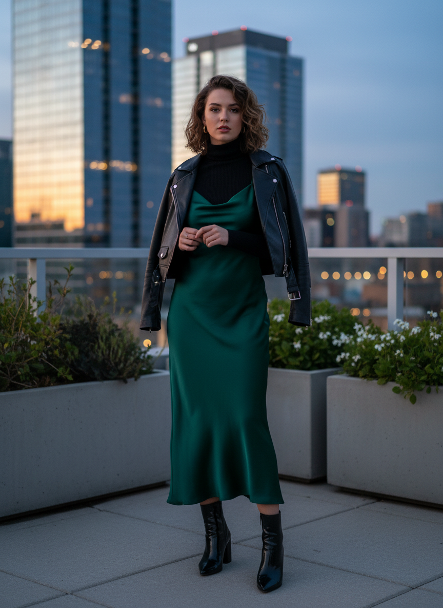 The fitted turtleneck adds warmth and structure, while the slip dress brings a soft, feminine touch on top.