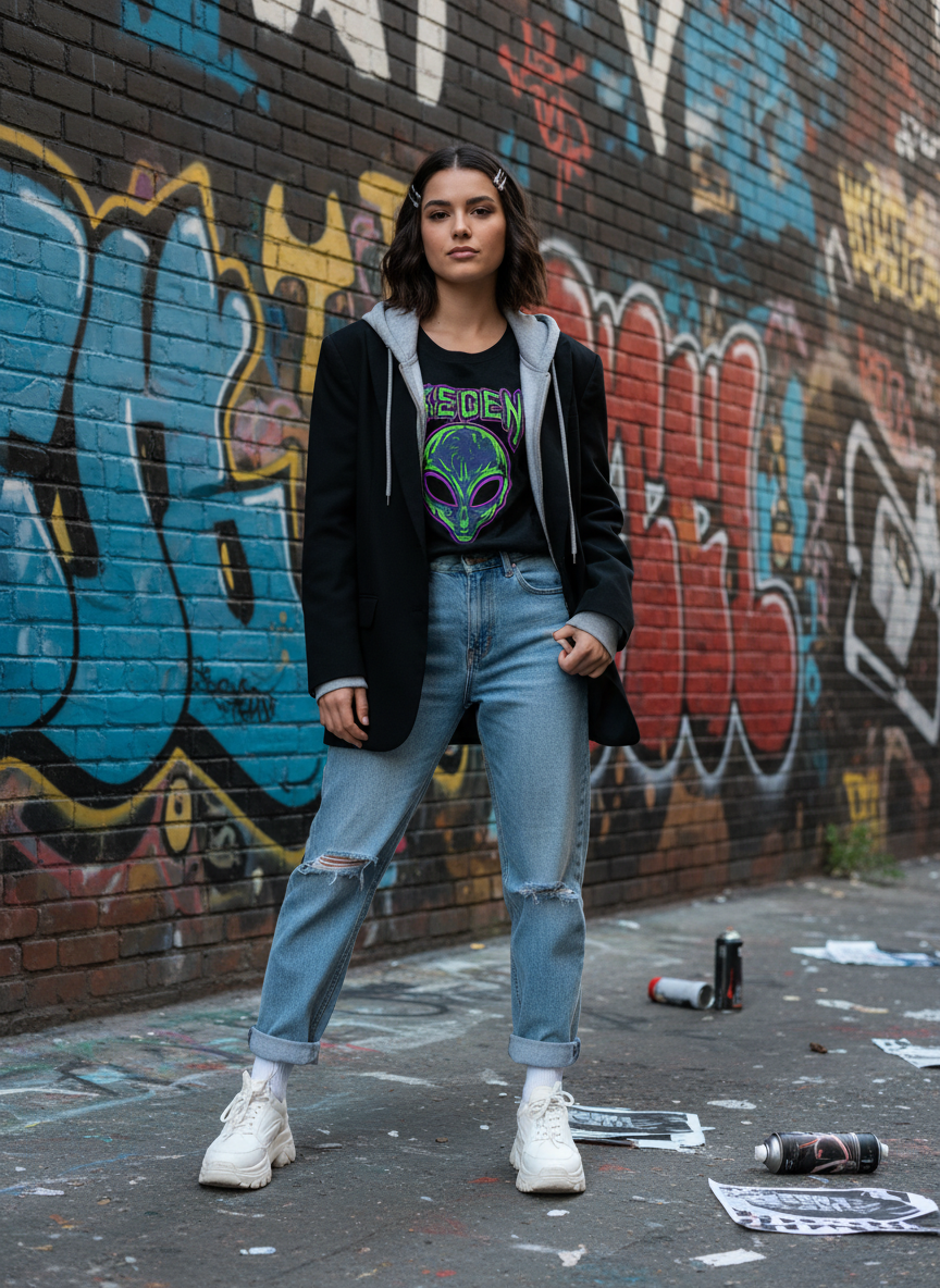 4. Graphic Tee + Hoodie + Structured Blazer + Relaxed Jeans + Chunky Sneakers