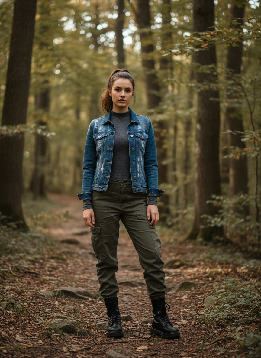 6. Long-Sleeve Base Layer + Denim Jacket + Cargo Pants + Combat Boots