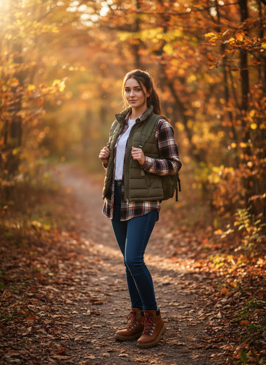 7. Basic Tee + Flannel Shirt + Puffer Vest + Slim Jeans + Hiking-Style Shoes