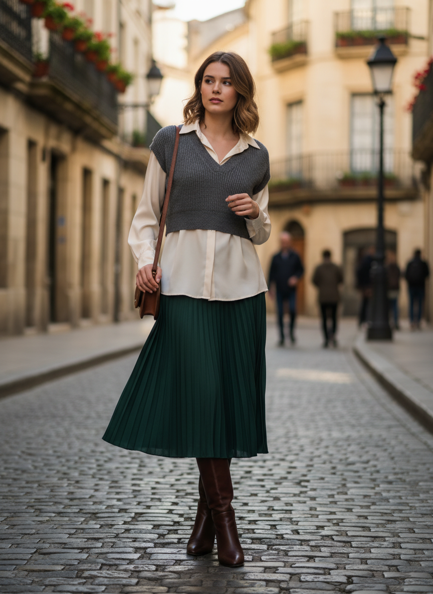 A midi skirt flowing below adds a romantic, feminine quality that pairs beautifully with tall boots.