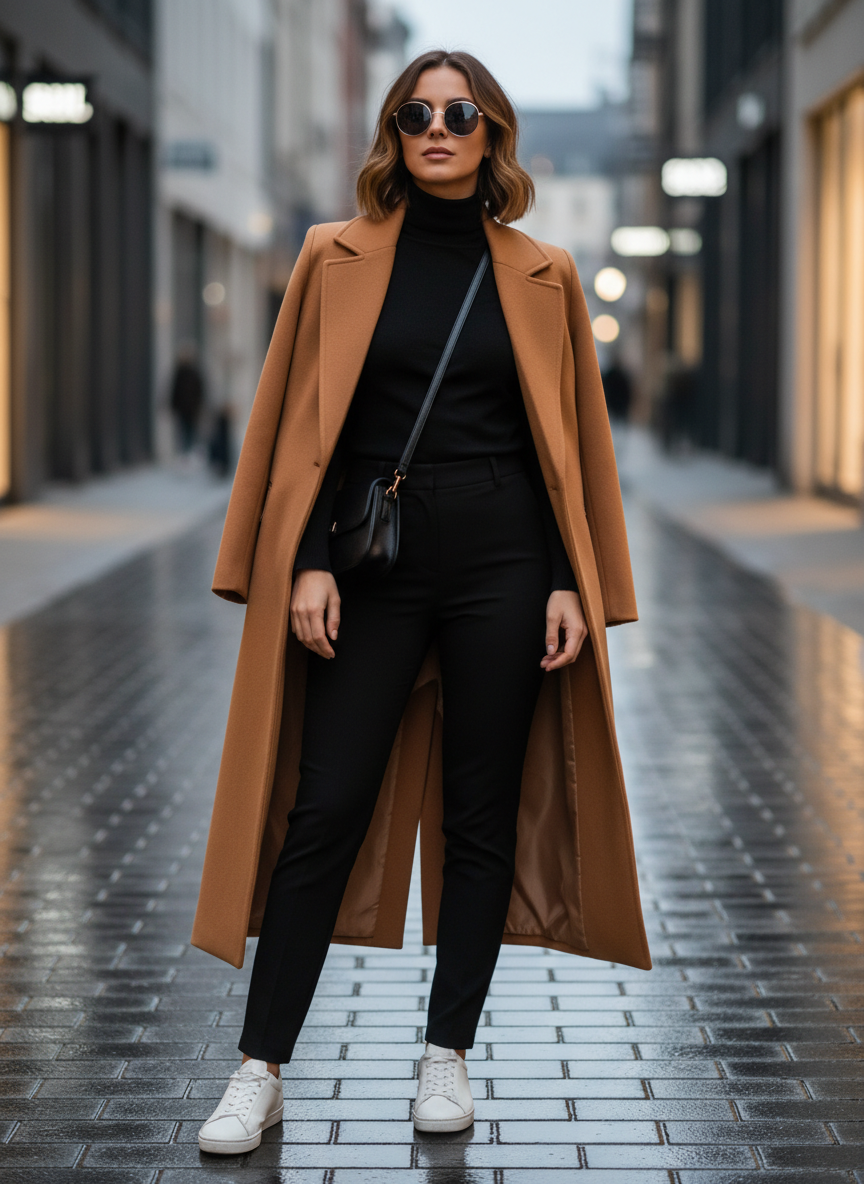 10. Monochrome Base + Contrasting Statement Coat + Minimal Sneakers