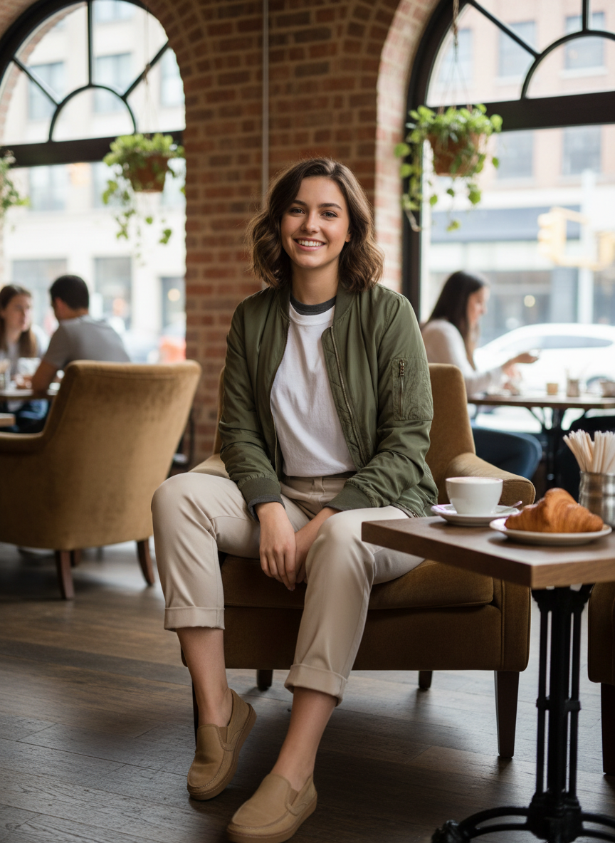 Chinos add a cleaner, more put-together feel compared to jeans, and a lightweight bomber jacket rounds out the look with effortless cool.