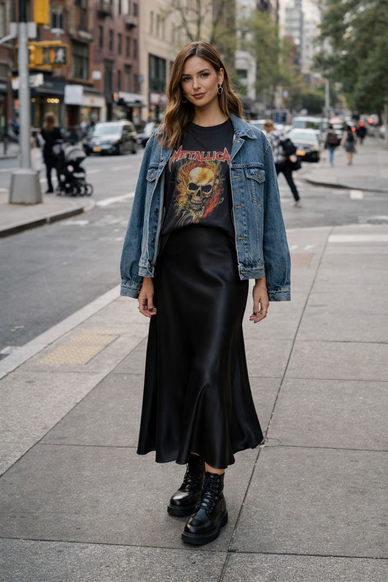 Street style gets a luxurious upgrade when you throw a vintage band tee over a flowing satin maxi skirt. This unexpected pairing creates an effortlessly cool vibe that feels both rebellious and refined. The graphic tee adds personality and keeps the outfit from feeling too formal or stuffy.