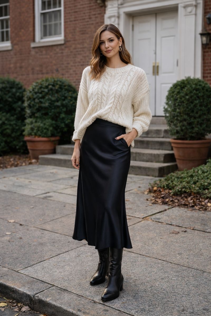 3. Chunky Knit Sweater and Satin Skirt