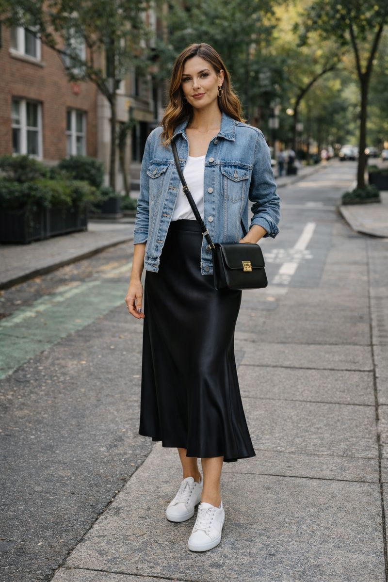 A classic denim jacket instantly casualizes a satin skirt, making it feel approachable and perfect for daytime activities.