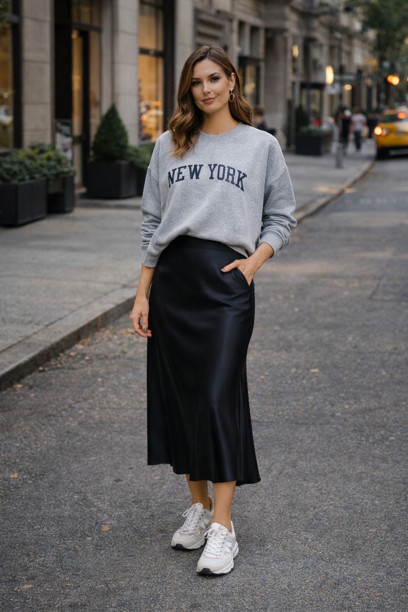 A relaxed graphic sweatshirt paired with a satin midi skirt creates an interesting high-low mix that feels fresh and modern.