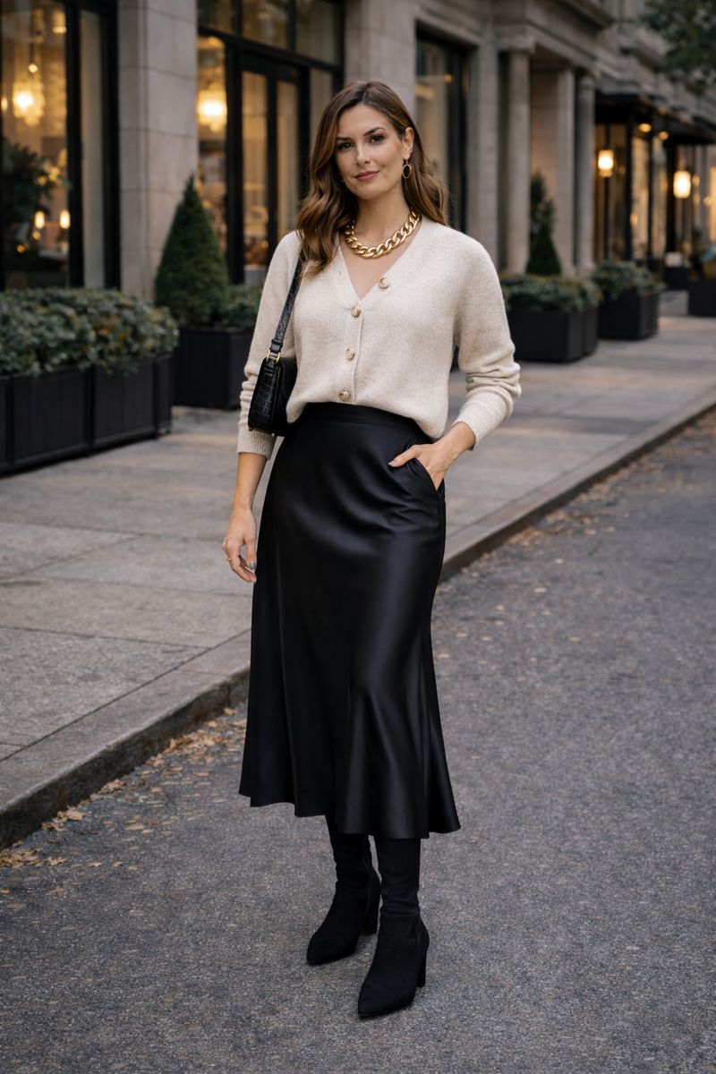 The cardigan brings warmth and comfort without the bulk of heavier outerwear, while the satin adds that touch of refinement that elevates the entire look.
