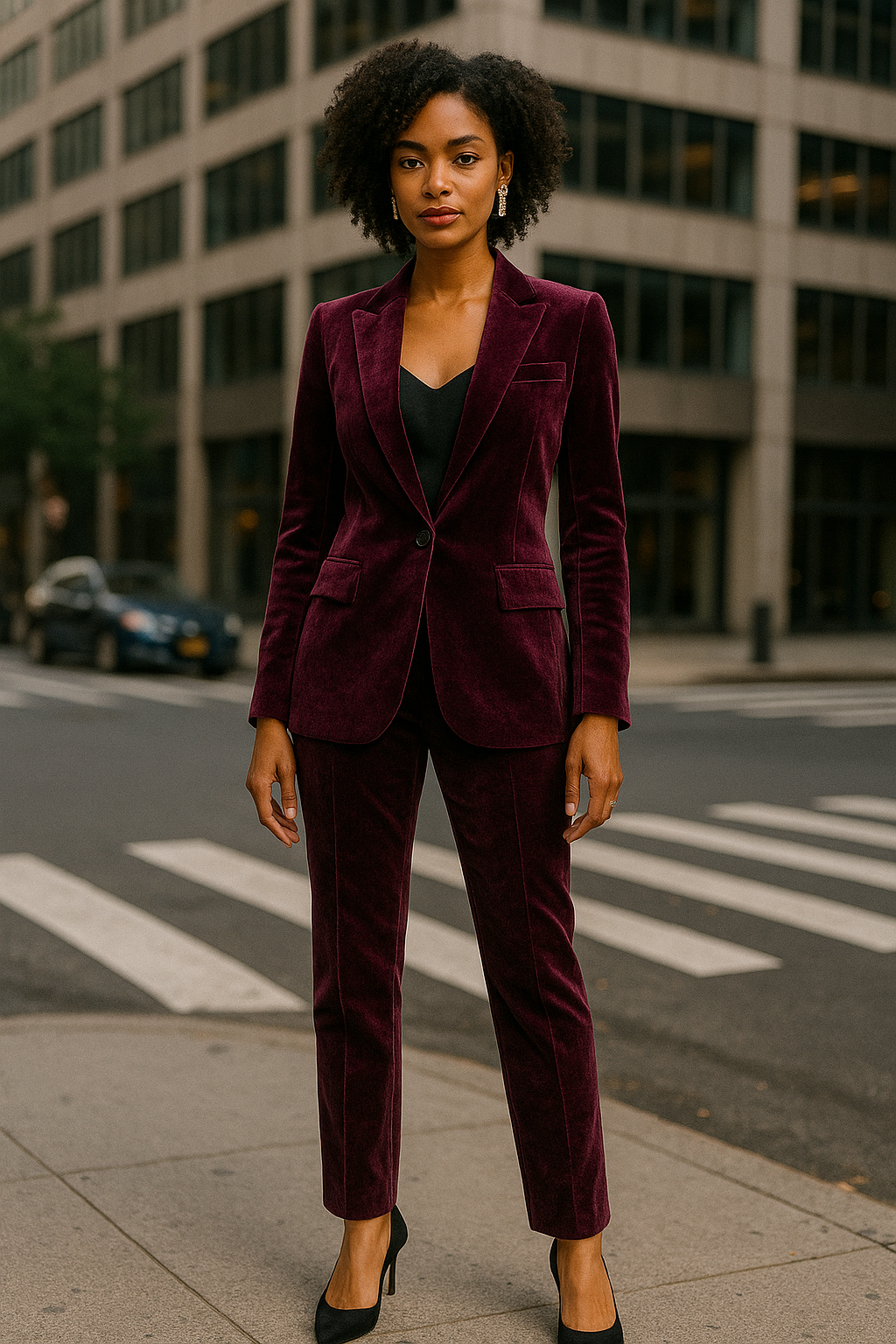 Wide-leg velvet pants create a dramatic silhouette, while fitted styles or velvet leggings keep things sleek and modern.