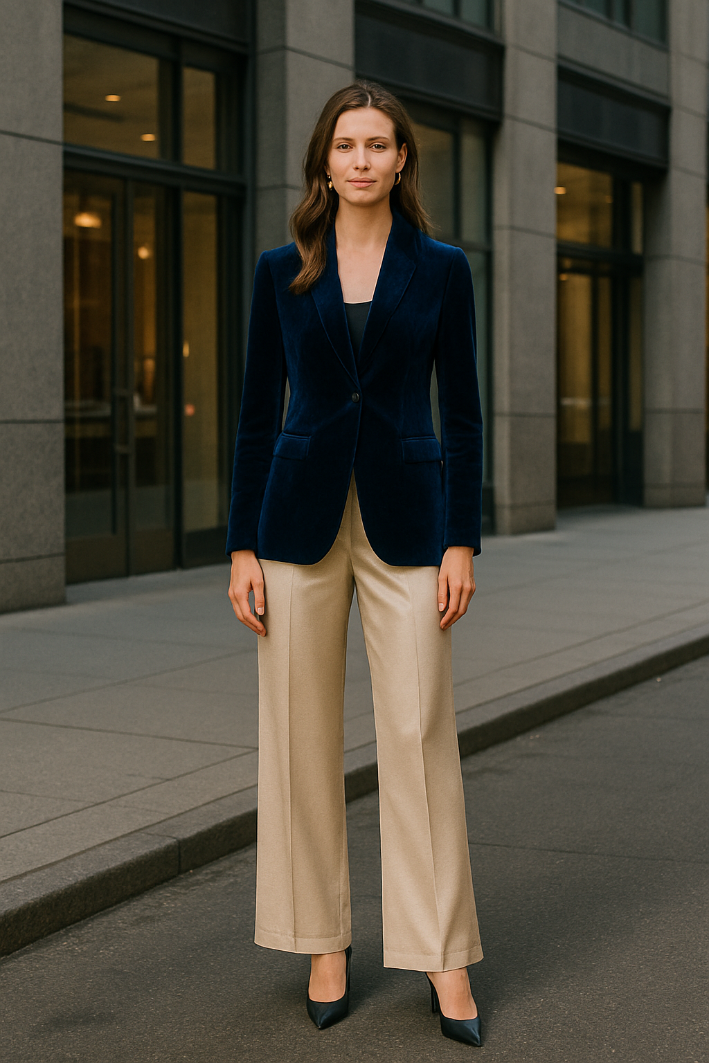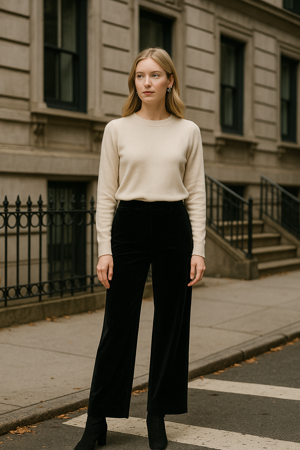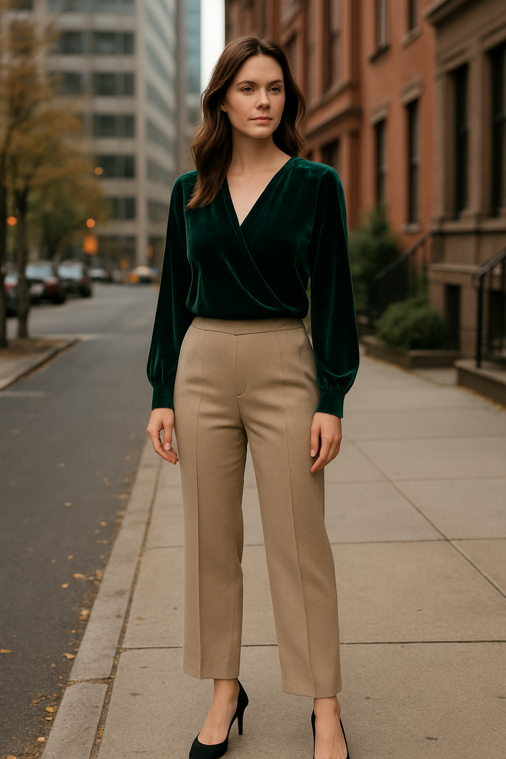 Pairing a luxe velvet blouse or fitted top with neutral bottoms adds just enough texture without overwhelming your entire outfit.
