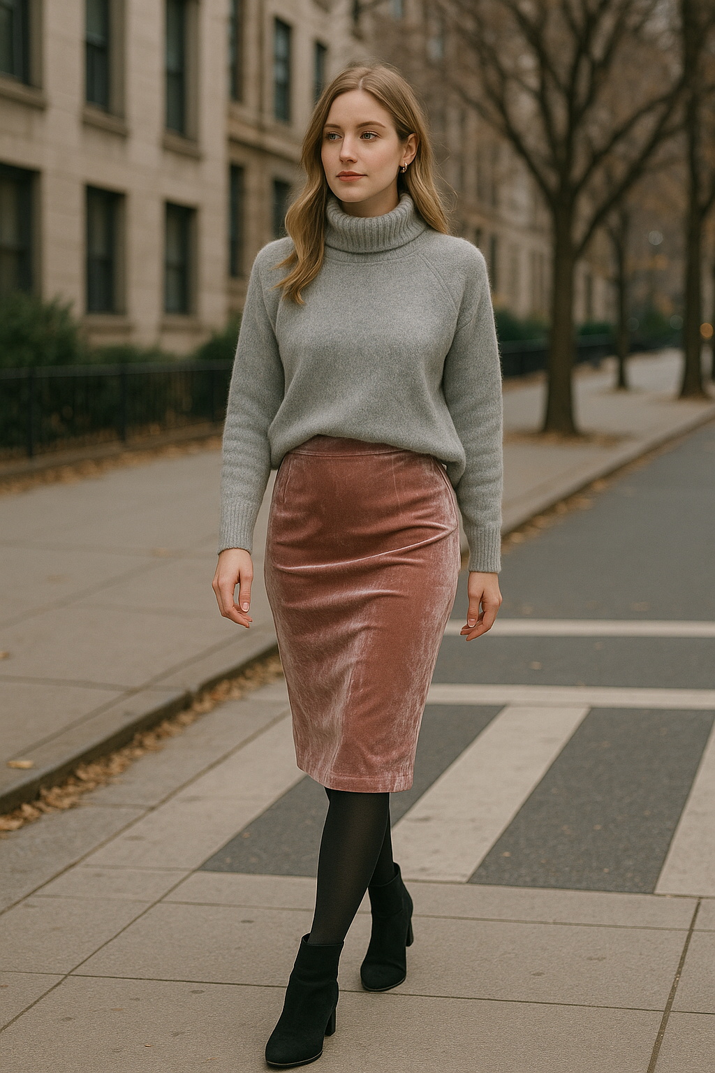 A velvet skirt with a chunky knit sweater creates that cozy-chic vibe everyone loves during the holidays.