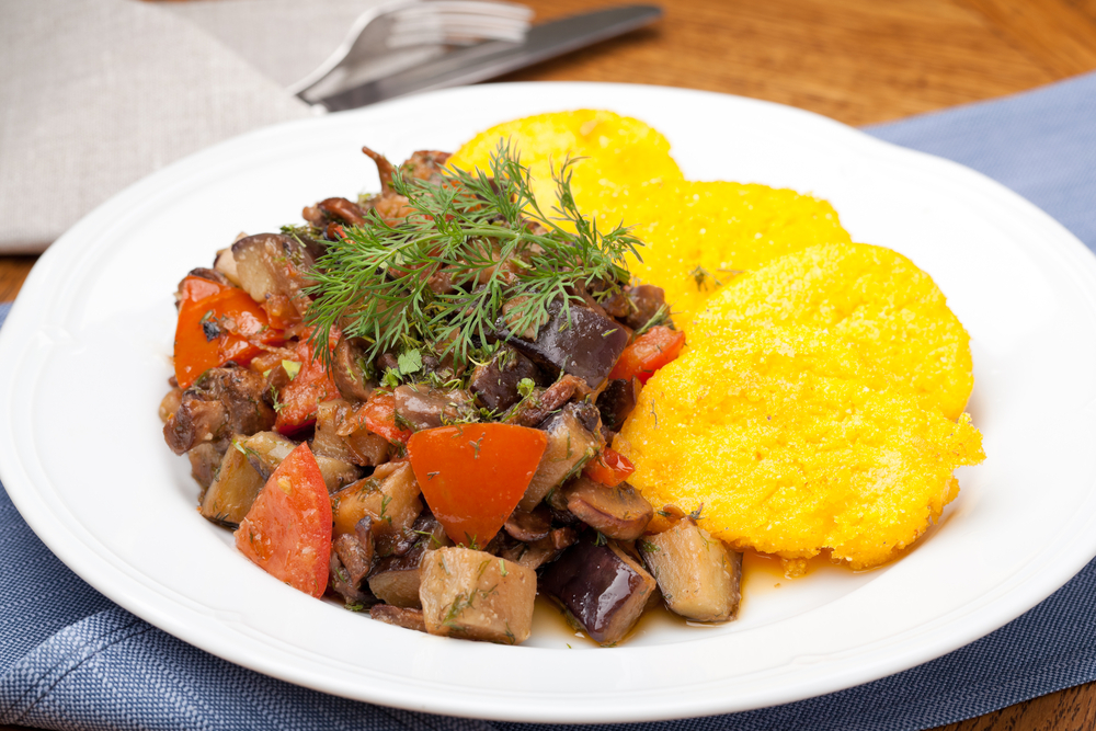 Eggplant, zucchini, bell peppers, and tomatoes are slowly cooked until tender and flavorful.