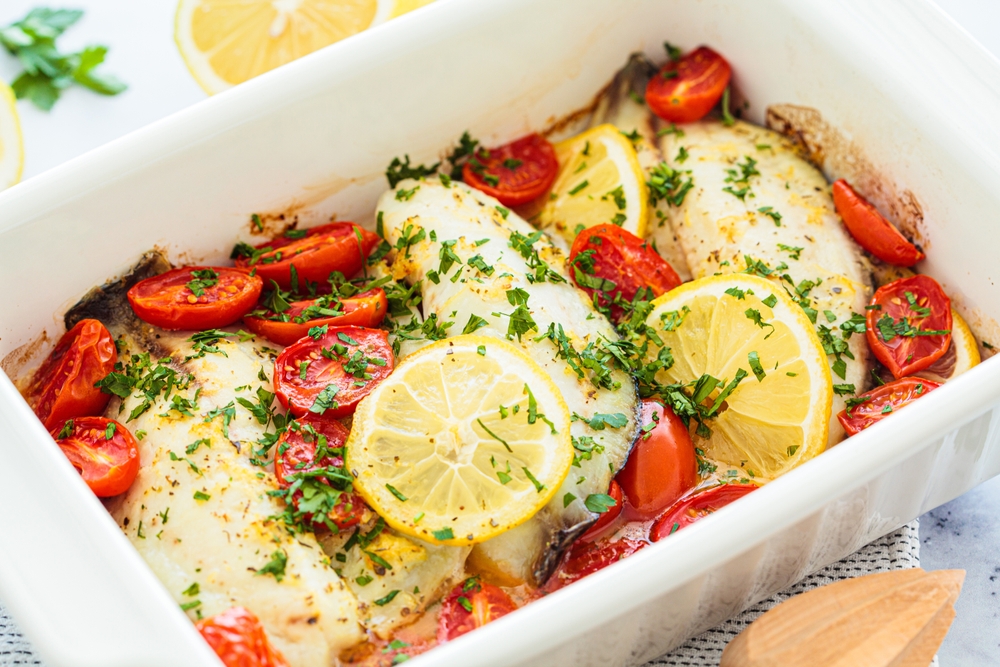 Fresh fish fillets bake to perfection with Mediterranean flavors that transport you to the coast.