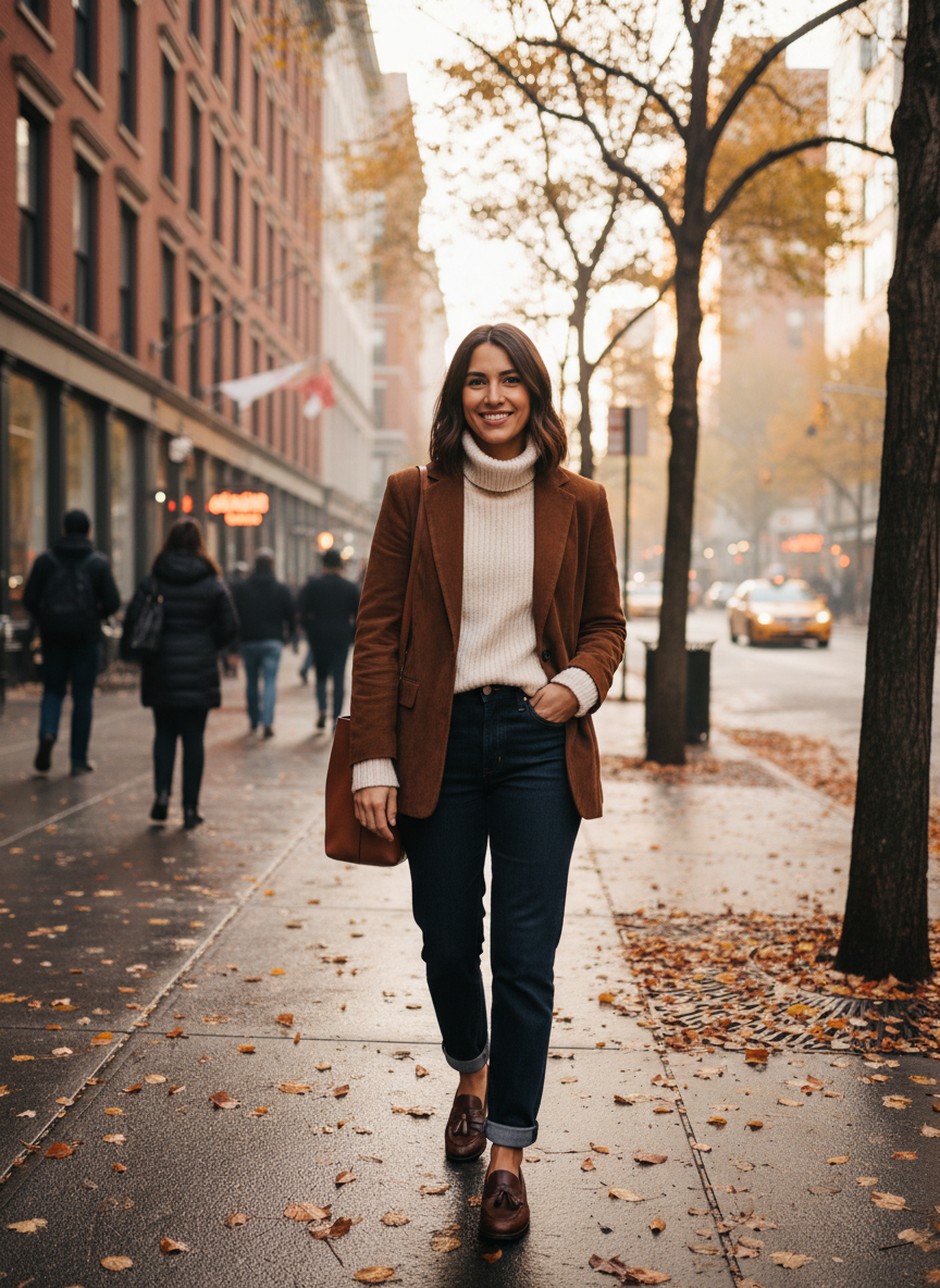 1. Chocolate Suede Blazer + Cream Turtleneck + Dark Straight Jeans + Loafers