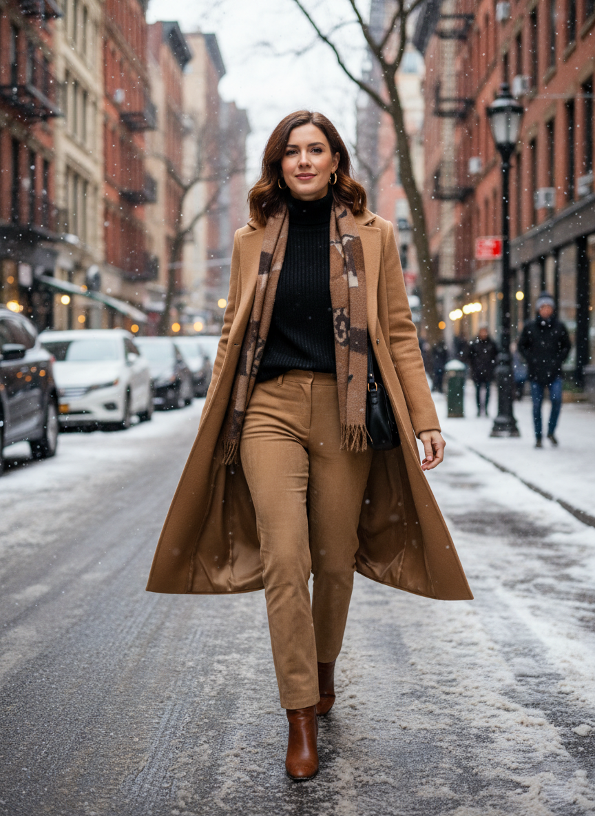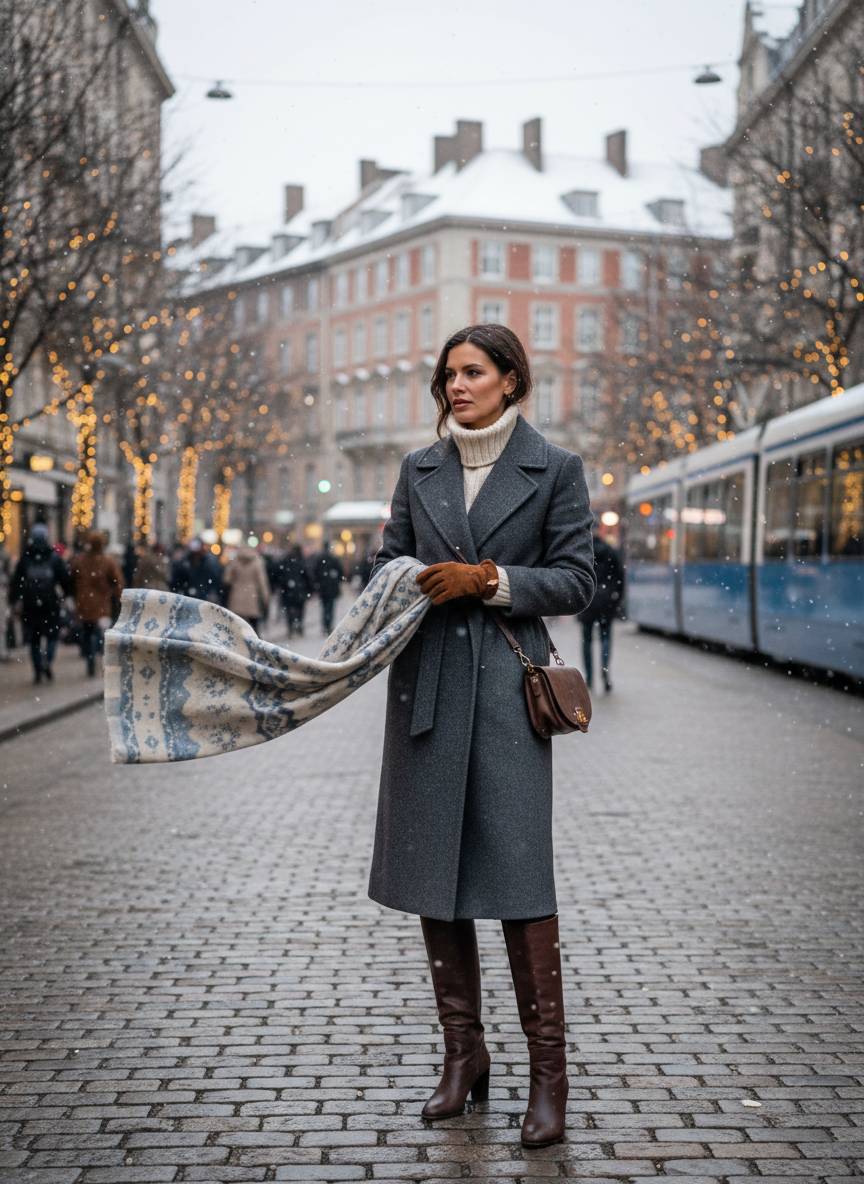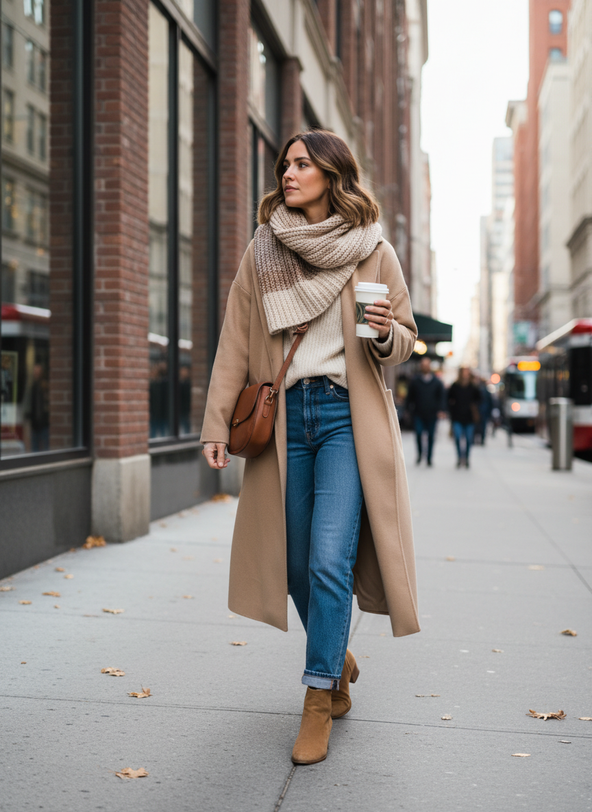 A cozy scarf adds warmth and texture without overwhelming the look.