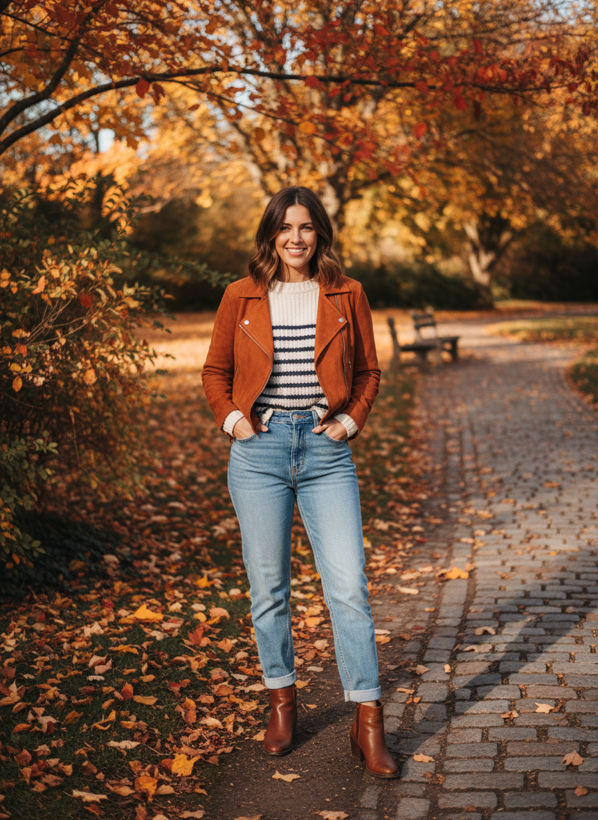 11. Rust Suede Jacket + Light-Wash Denim + Striped Knit + Boots