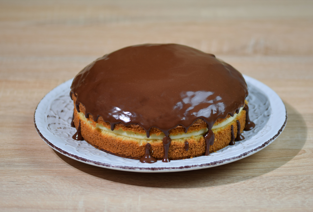 Two layers of light, airy sponge cake sandwich a thick layer of creamy vanilla pastry cream in the middle.