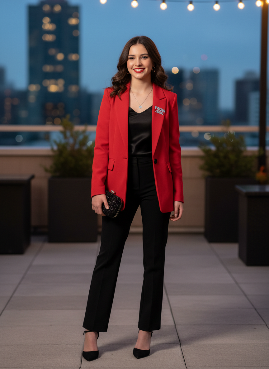 Red and black is one of the most iconic color combinations in fashion history, and mixing a red blazer with black trousers brings that classic energy straight to prom night.