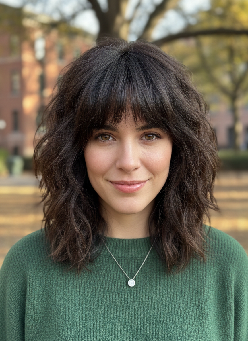 Bangs frame your face beautifully while adding to the overall shaggy aesthetic.