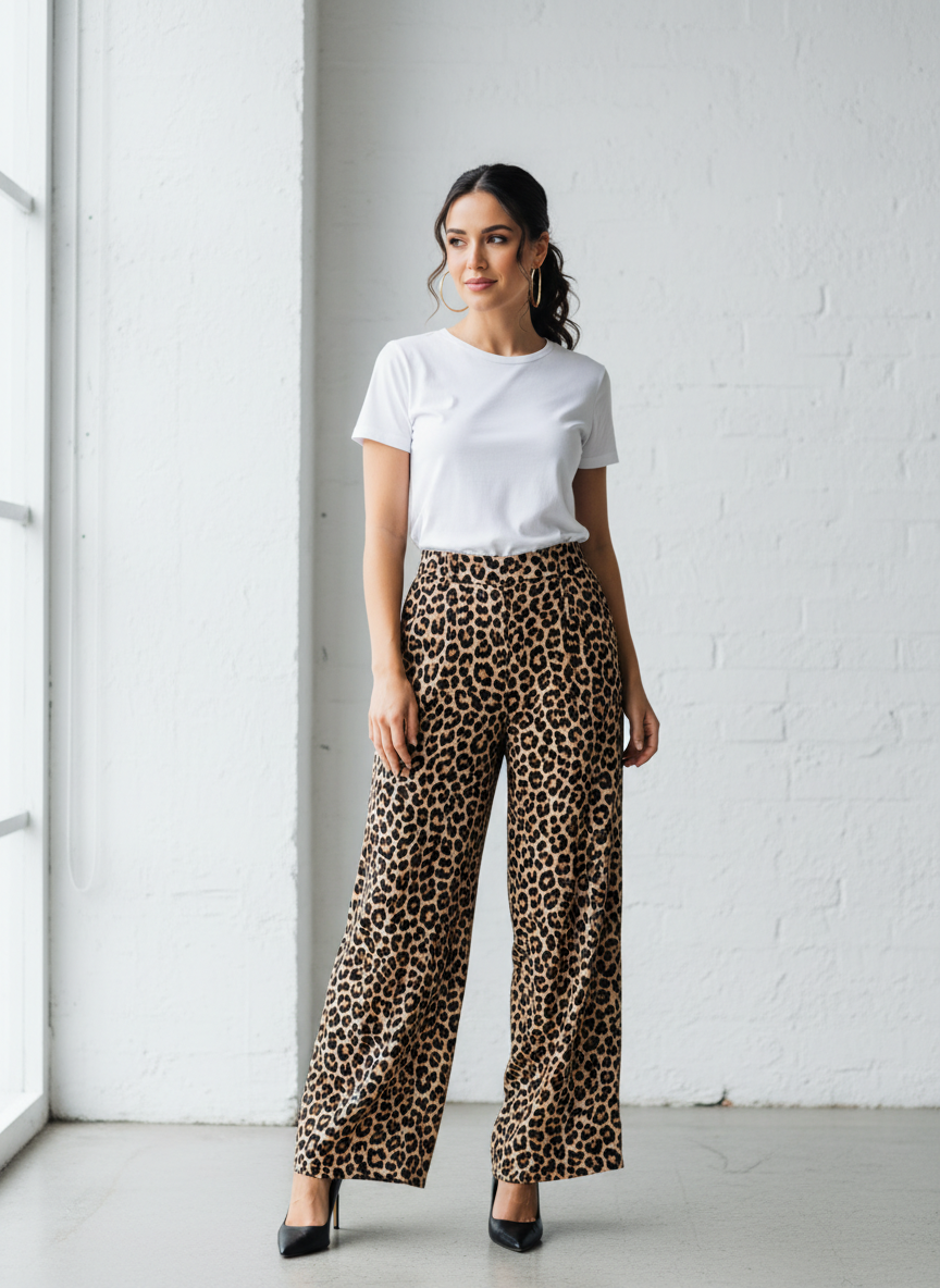 Leopard trousers sound intimidating until you realize they follow the same rules as any statement bottom — let them lead, and keep everything else quiet.