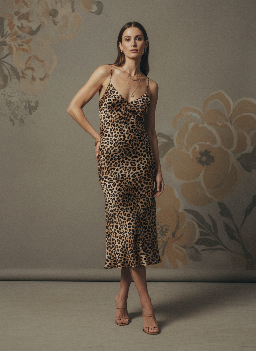 A bias-cut leopard slip dress moves beautifully, clings in the right places, and looks expensive without trying.