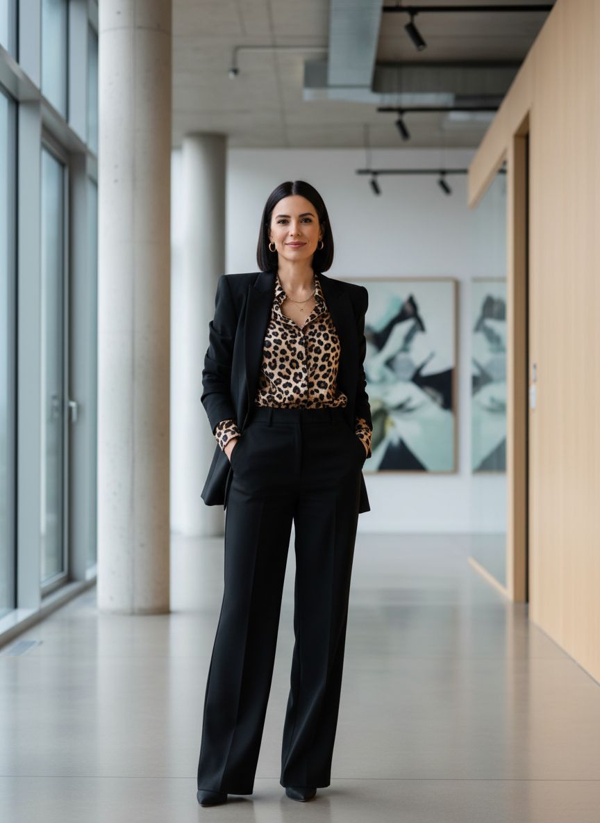 Pair a leopard top or blouse with a fully structured black or cream suit.