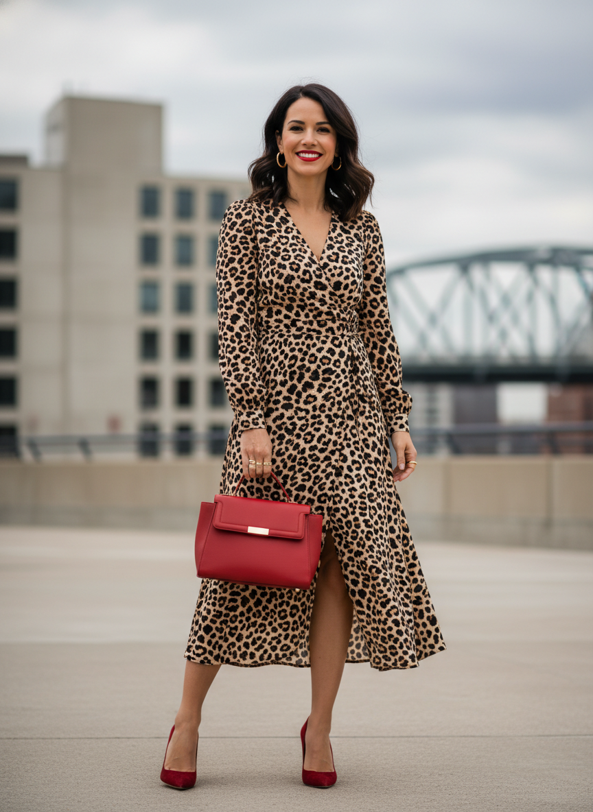 A red handbag, a pair of red heels, or even a classic red lip is enough to shift the entire energy of a leopard look.