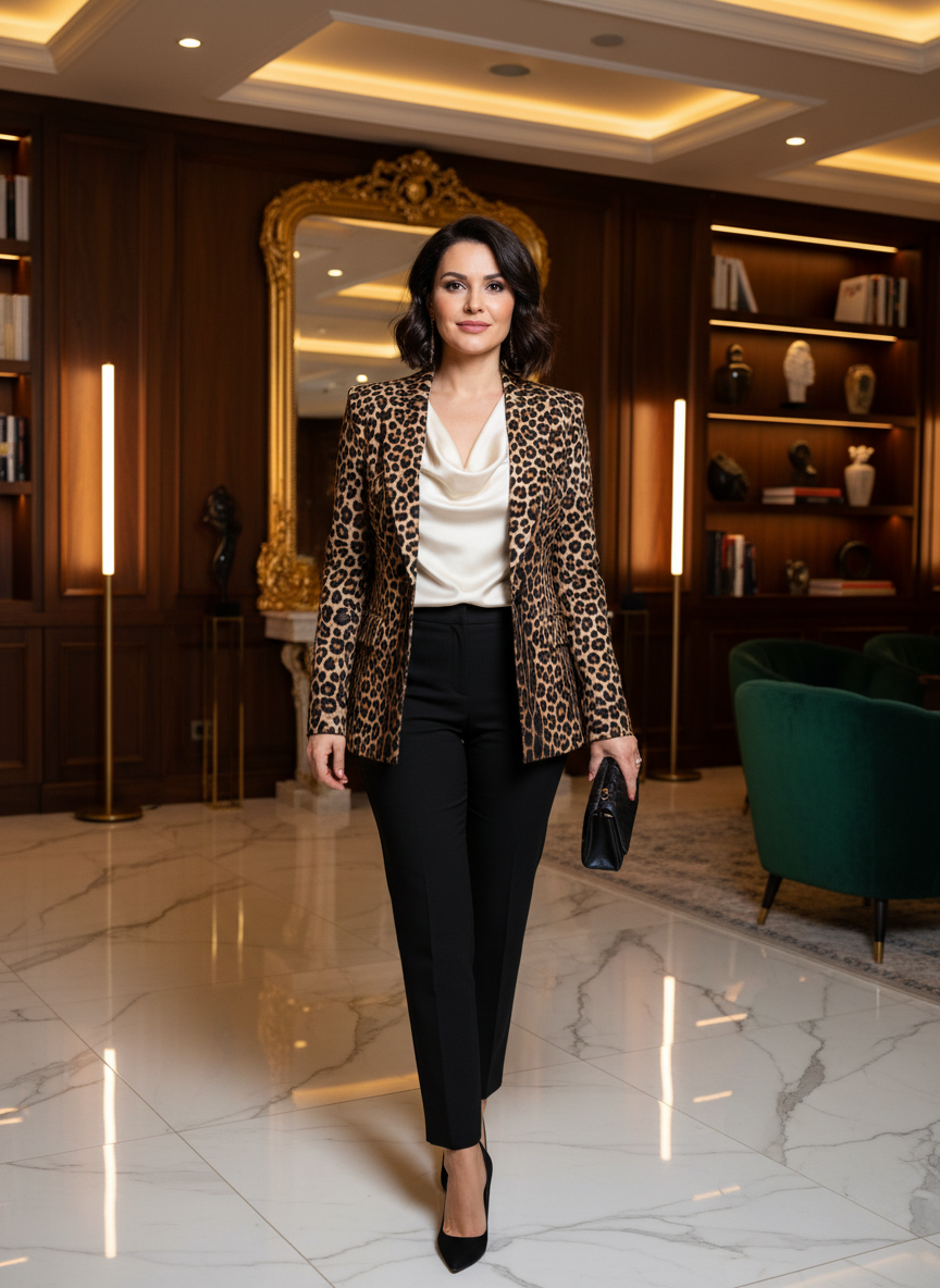 Try pairing a structured leopard blazer over a silk or satin blouse with tailored trousers.
