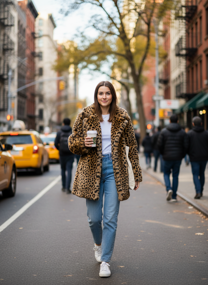 There’s something almost rebellious about throwing a wild leopard coat over the most basic outfit imaginable — and somehow it just works.