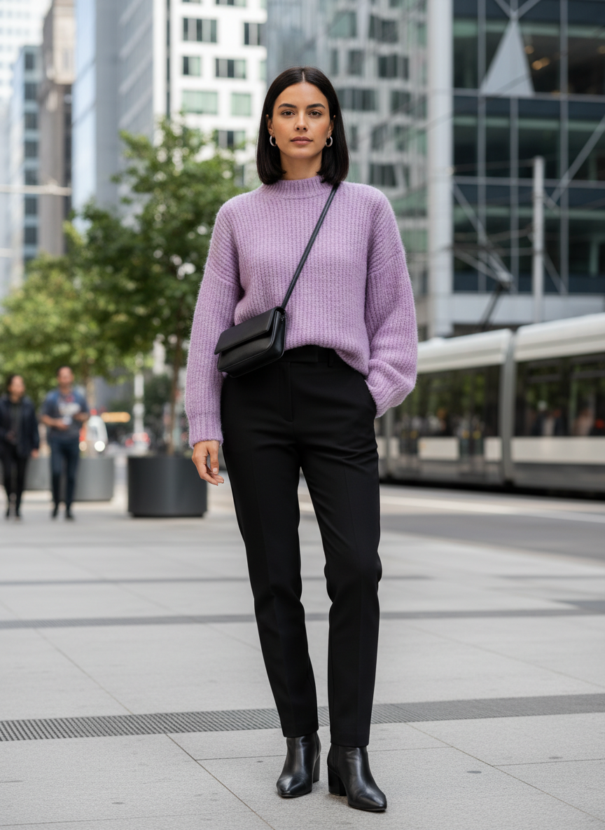 The soft purple knit adds a gentle warmth, while the black trousers keep everything grounded and professional.