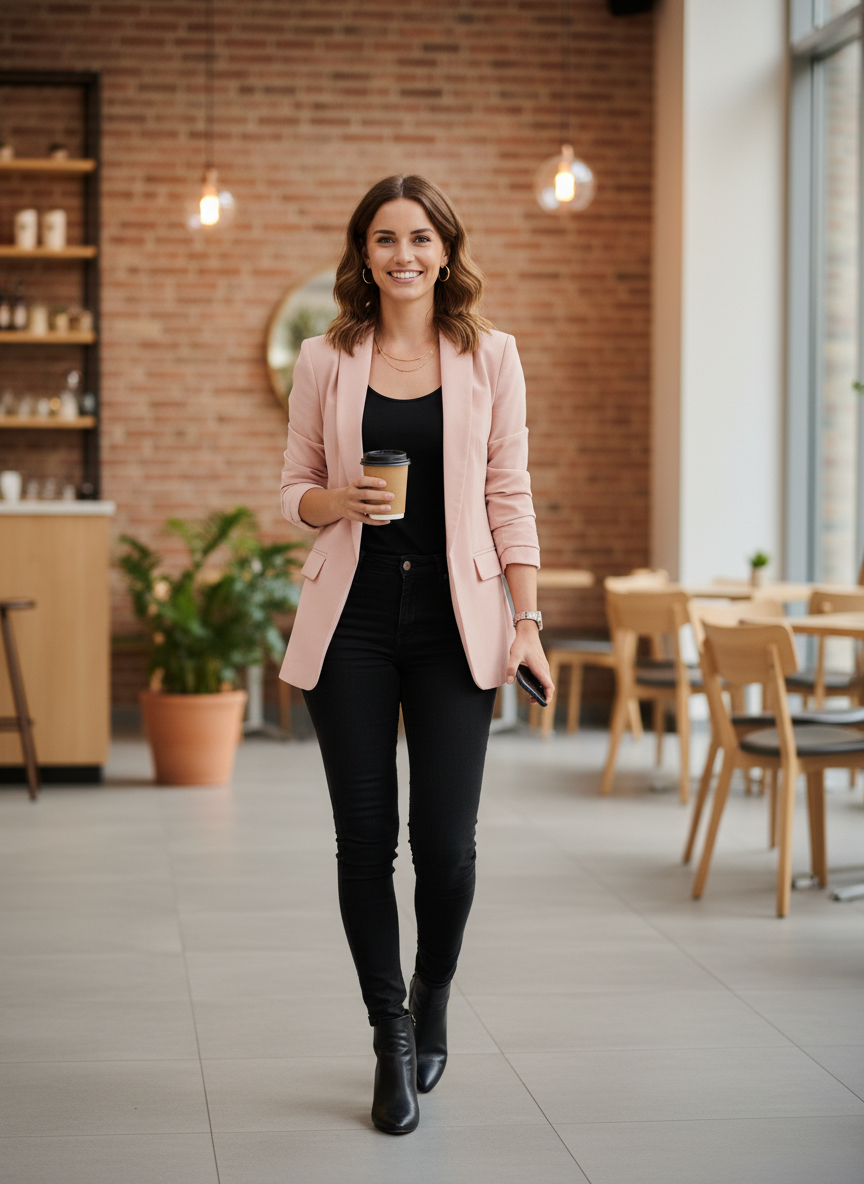 What’s clever about this outfit is how the blush blazer becomes the star without competing with anything else.