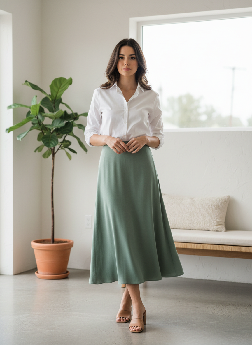 6. Sage Green Midi Skirt + White Button-Down + Neutral Heels