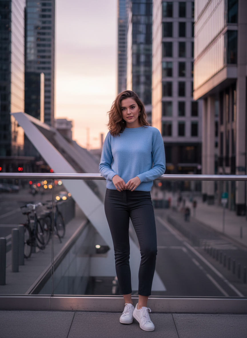 7. Baby Blue Sweater + Dark Gray Trousers + White Sneakers