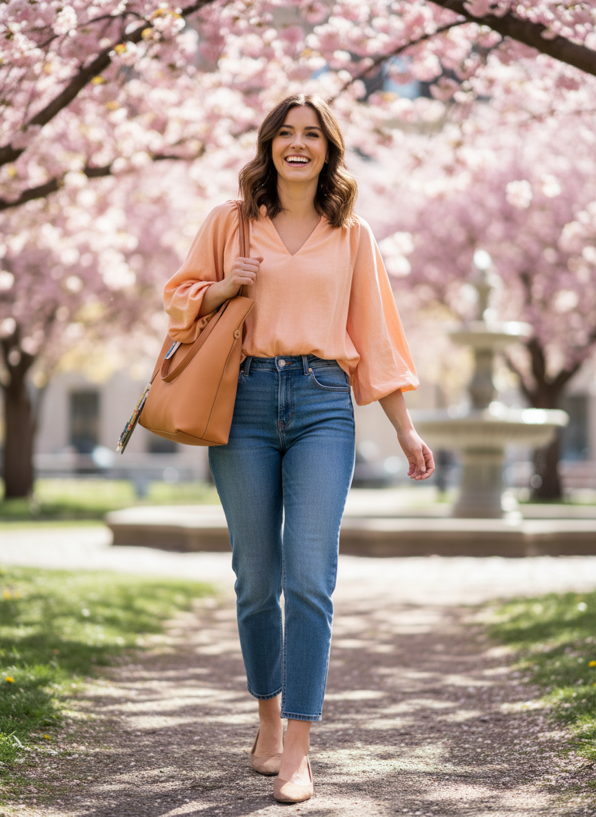 8. Peach Blouse + Medium Wash Jeans + Tan Leather Bag + Neutral Flats