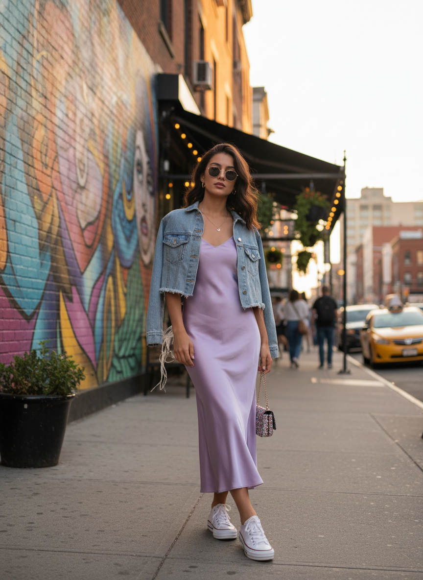 9. Lilac Slip Dress + Cropped Denim Jacket + White Sneakers