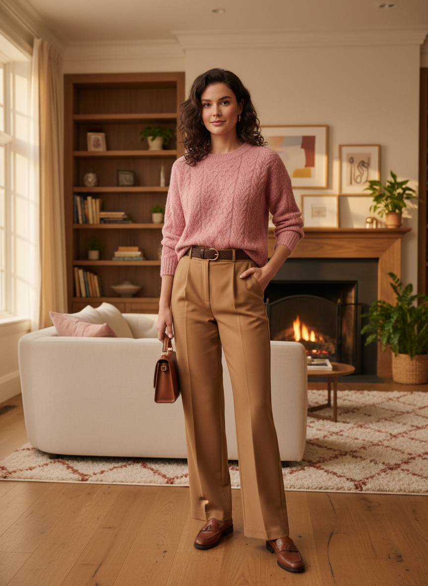 10. Soft Pink Sweater + Camel Trousers + Brown Belt + Loafers
