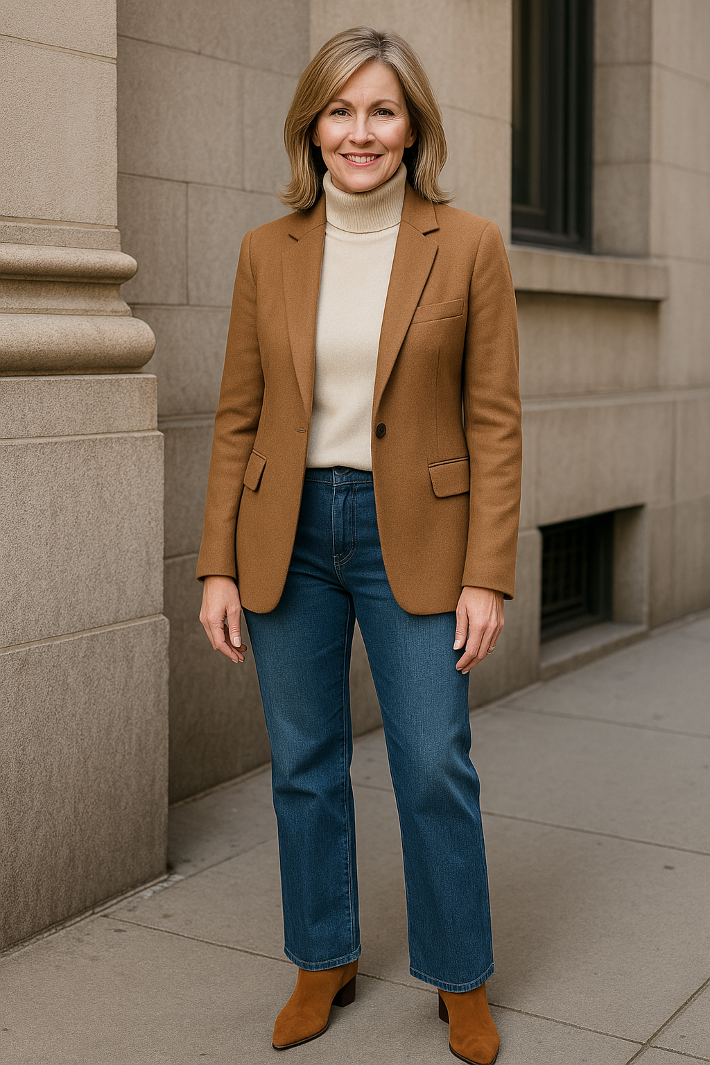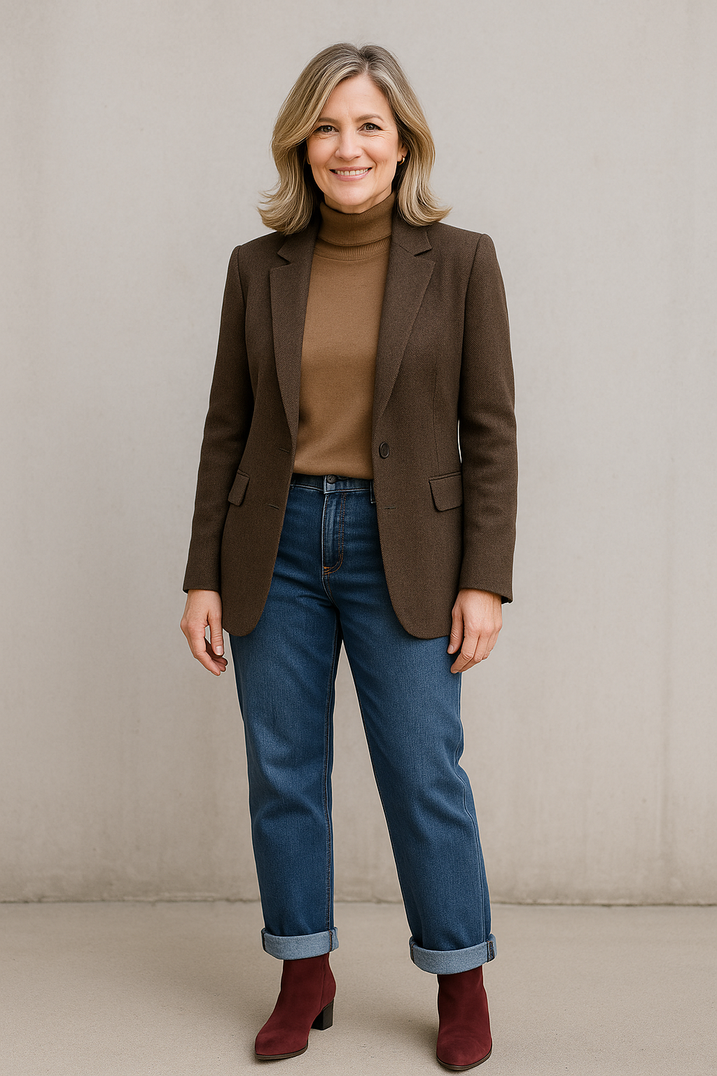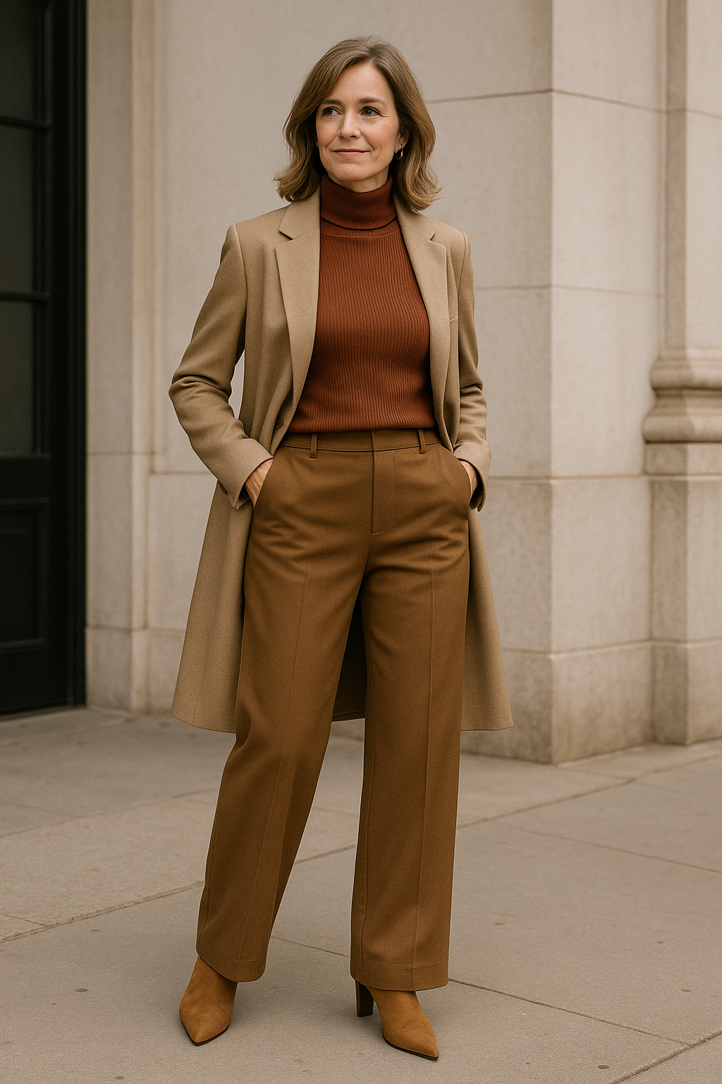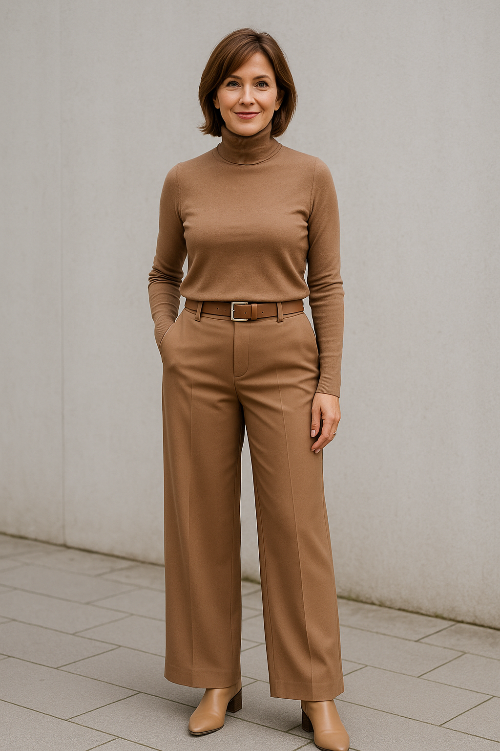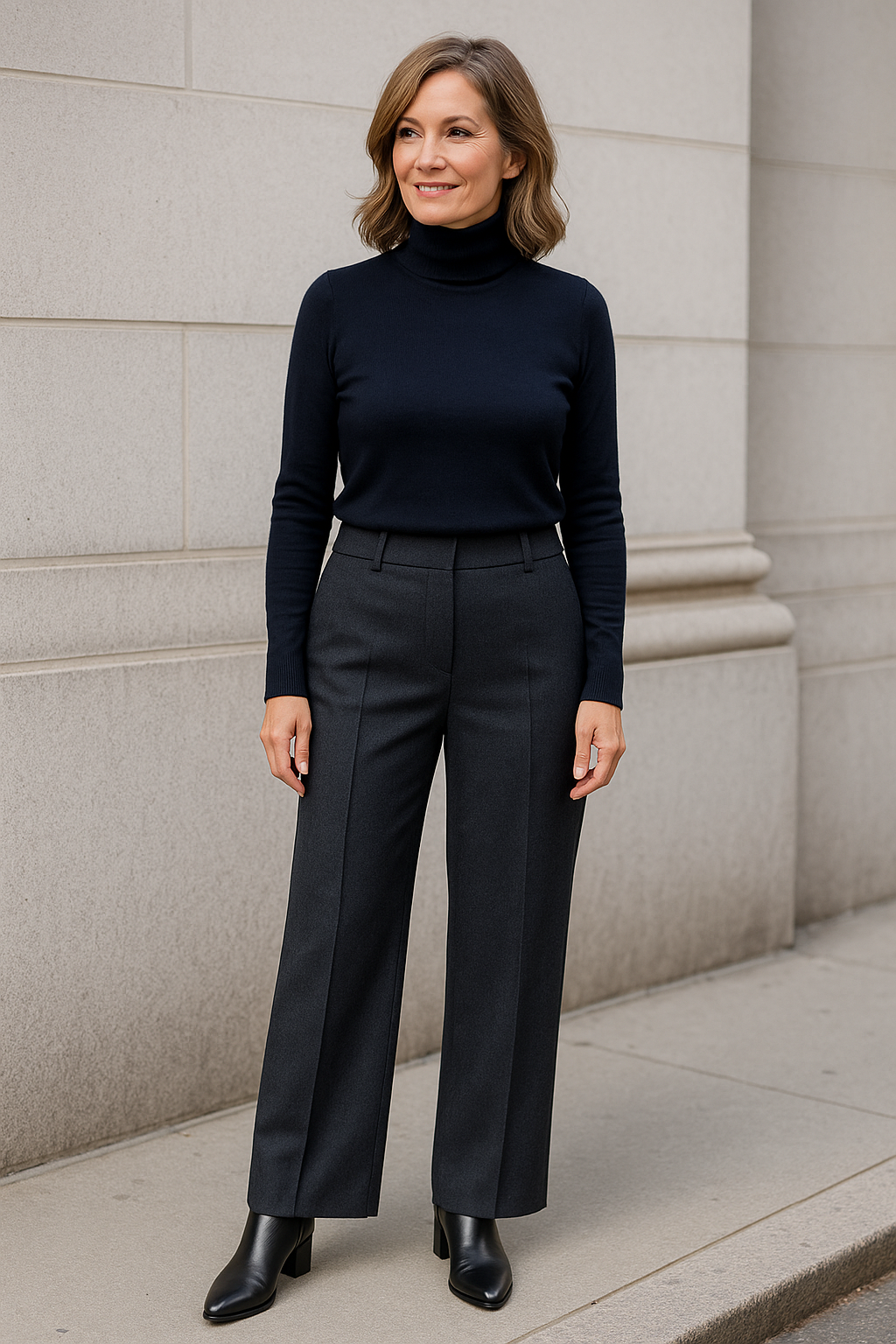 A tucked-in turtleneck, crisp button-down, or belted cardigan defines your waist and keeps the look sharp — not shapeless.