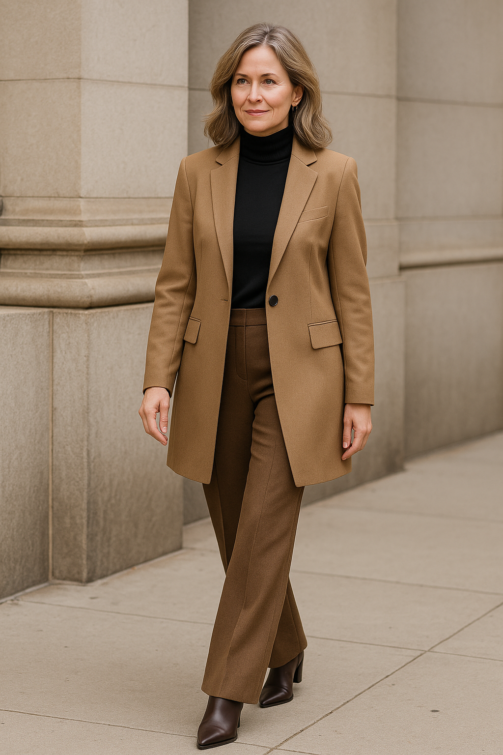 A full-length coat or sharp blazer adds instant polish. Look for pieces that skim your frame — not drown it — for that sleek, vertical line that flatters every figure.