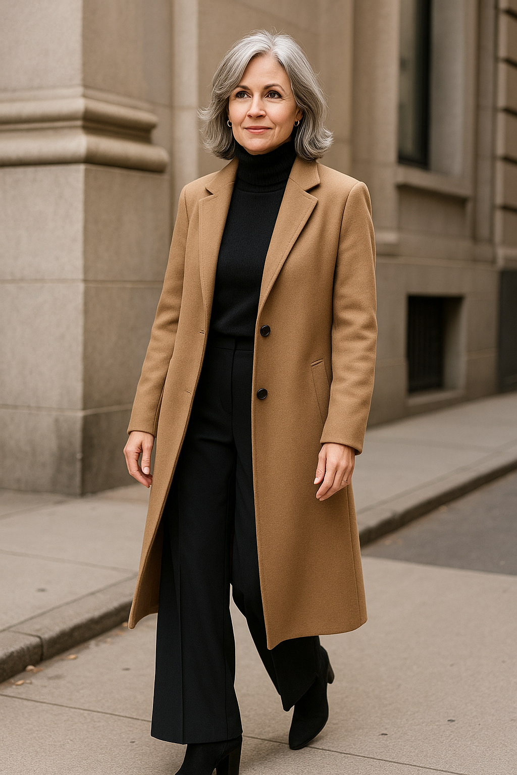 Choose coats that hit mid-thigh or longer, and make sure they fit well through the shoulders. A well-tailored outer layer elevates everything underneath it instantly.