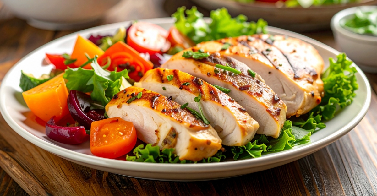 Picture a colorful bowl packed with fresh lettuce, crunchy cucumbers, juicy tomatoes, and tender grilled chicken strips on top.
