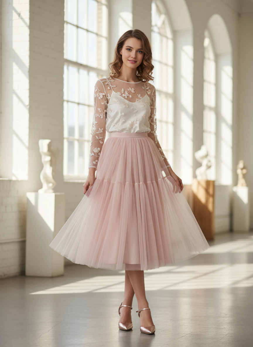 A straight skirt or well-fitted trousers anchor the softness of the tutu element so the look stays polished.