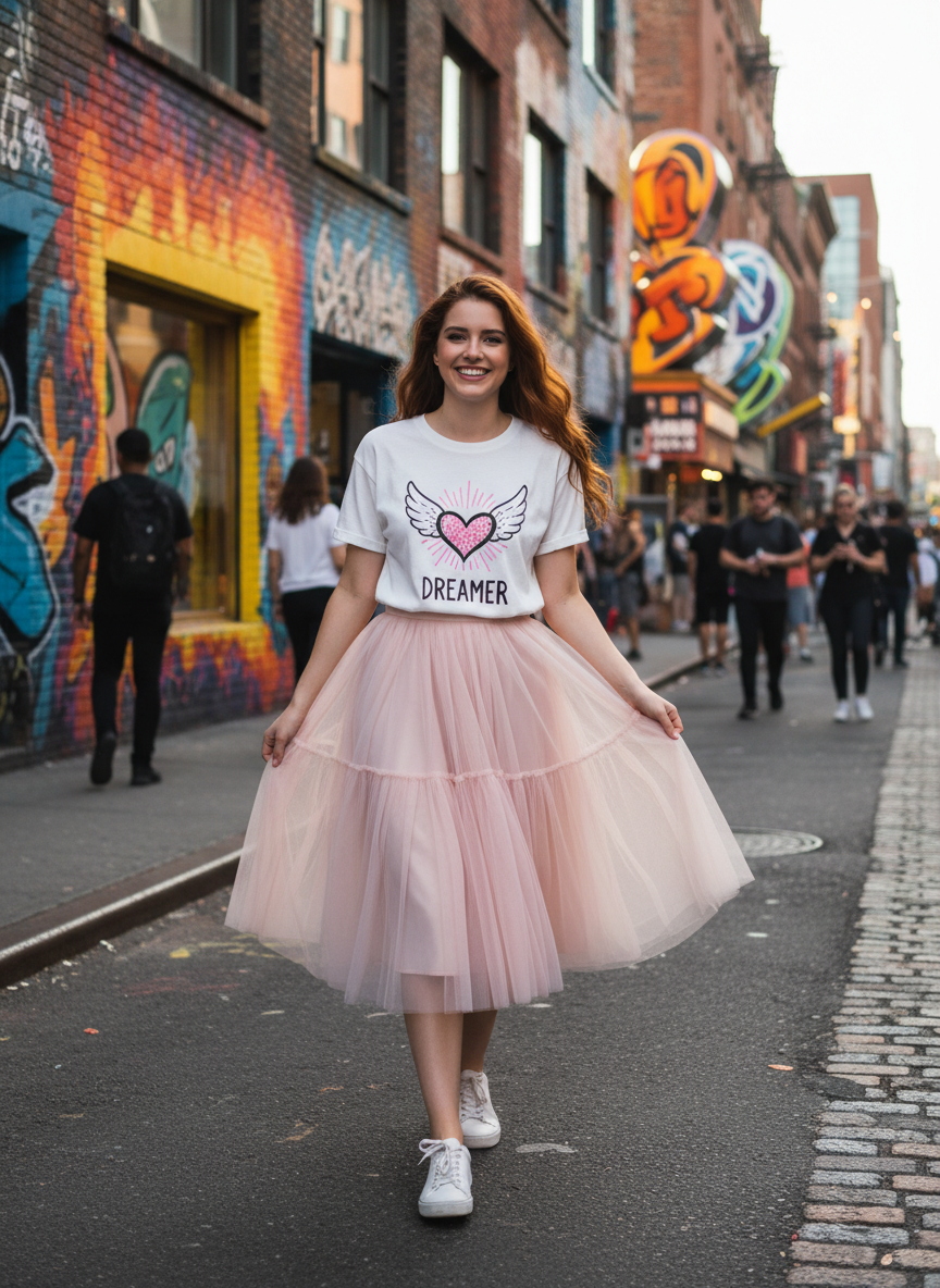 The contrast between the casual, everyday feel of a tee and the theatrical volume of tulle is what makes the look so visually interesting.