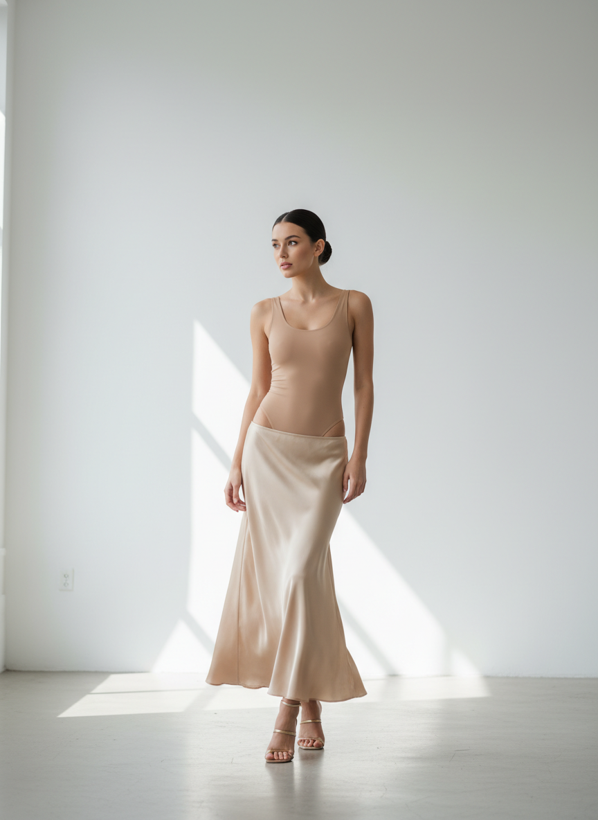 A nude bodysuit paired with a slip skirt in champagne or ivory creates a seamless, elongated silhouette that feels almost architectural in its simplicity.