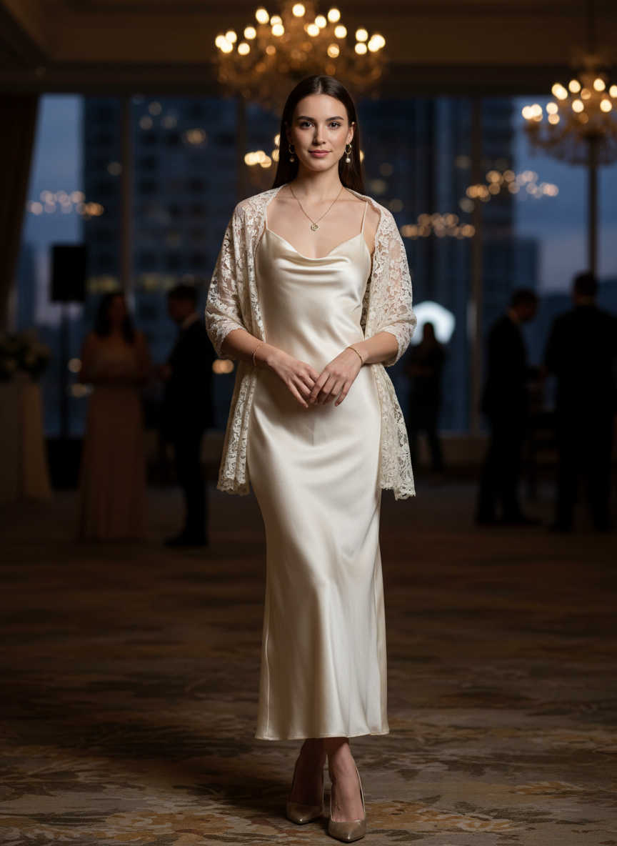 A light shawl or wrap draped over the shoulders adds warmth and a graceful, almost theatrical quality that feels completely intentional.