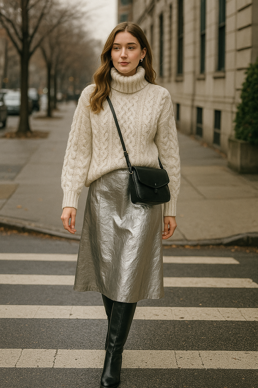 1. Chunky Cable-Knit Sweater + Metallic Midi Skirt + Tall Sleek Boots